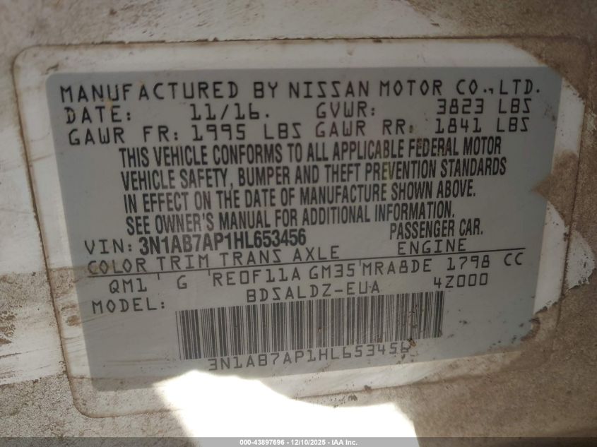 2017 NISSAN SENTRA - 3N1AB7AP1HL653456, цвет - Белый, 1.8, Бензин, Передний привод из США