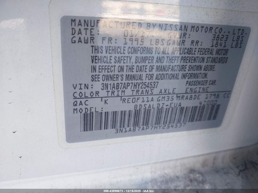 2017 NISSAN SENTRA - 3N1AB7AP7HY254537, цвет - Белый, 1.8, Бензин, Передний привод из США