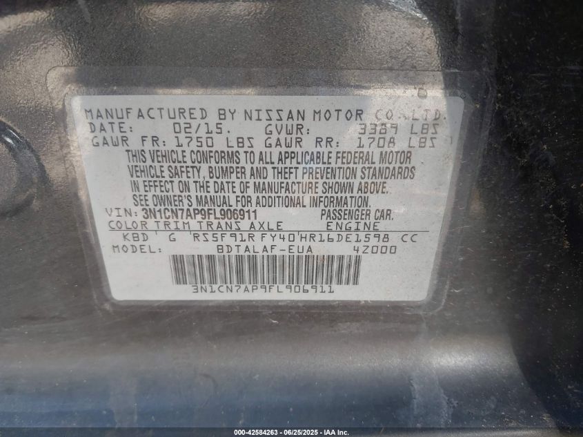2015 NISSAN VERSA - 3N1CN7AP9FL906911, цвет - Серый, 1.6, Бензин, Передний привод из США