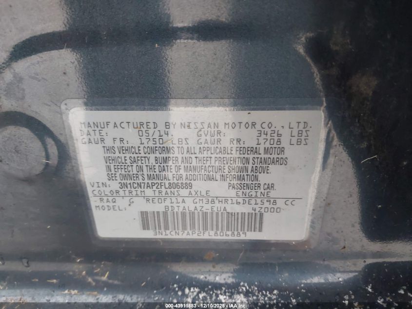 Цвет СинийЦилиндры 4Привод Передний приводVIN 3N1CN7AP2FL806889Состояние ЗаводитсяПовреждения Обычный износДата аукциона 2025-12-17