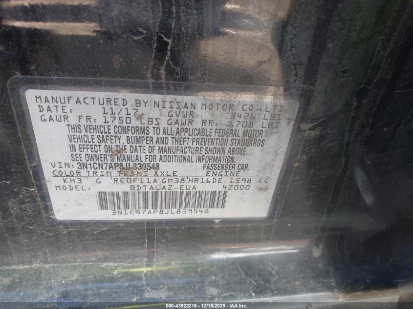 2018 NISSAN VERSA - 3N1CN7AP8JL839548, цвет - , 1.6, Бензин, Передний привод из США