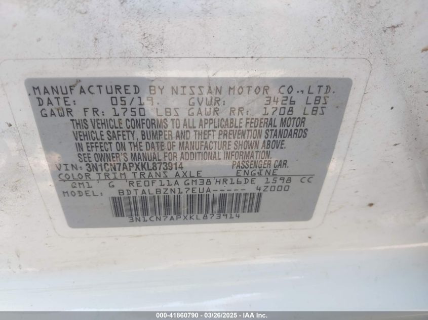 2019 NISSAN VERSA - 3N1CN7APXKL873914, цвет - Белый, 1.6, Бензин, Передний привод из США
