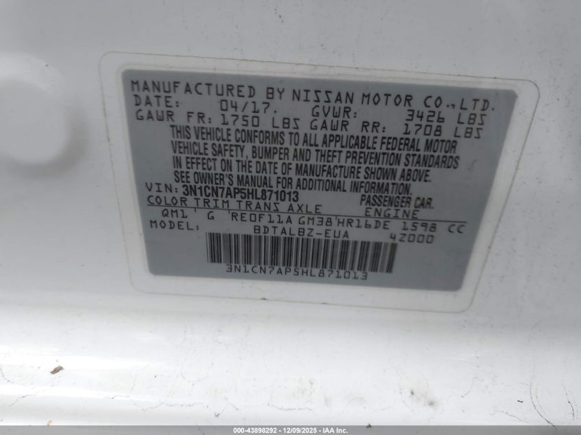 2017 NISSAN VERSA - 3N1CN7AP5HL871013, цвет - Белый, 1.6, Бензин, Передний привод из США