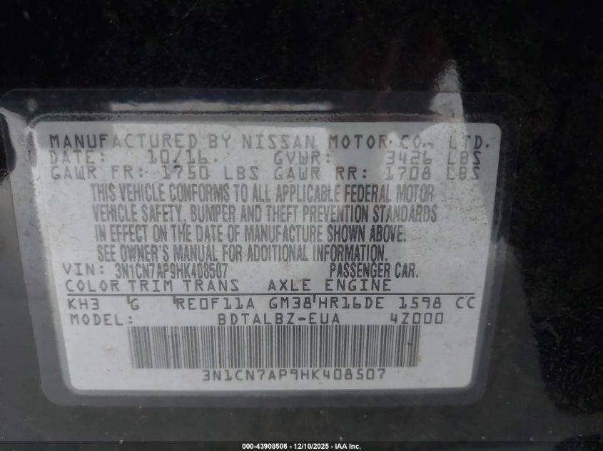 2017 NISSAN VERSA - 3N1CN7AP9HK408507, цвет - Черный, 1.6, Бензин, Передний привод из США