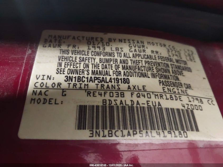 Цвет КрасныйЦилиндры 4Привод Передний приводVIN 3N1BC1AP5AL419180Состояние Заводится и едет (проверено)Повреждения Передняя или задняяДата аукциона 2025-12-17