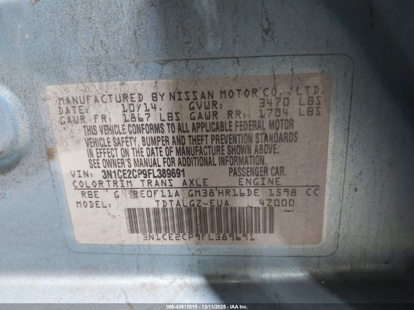 2015 NISSAN VERSA NOTE - 3N1CE2CP9FL389691, цвет - Синий, 1.6, Бензин, Передний привод из США