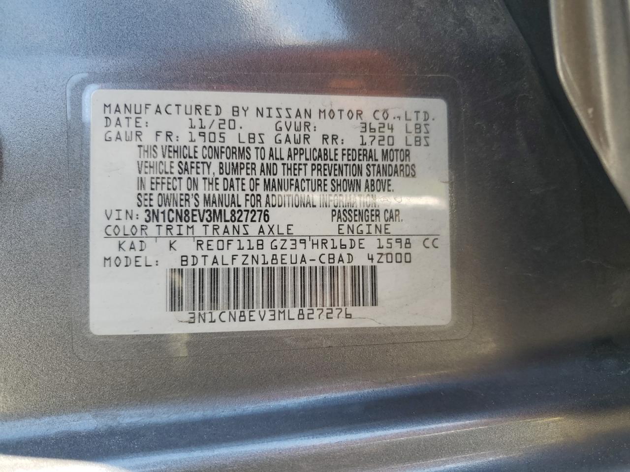 Цвет СерыйЦилиндры 4VIN 3N1CN8EV3ML827276Состояние ЗаводитсяПовреждения Передняя или задняяДата аукциона 2025-10-09