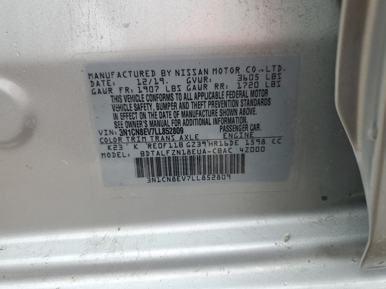 Цвет СеребряныйЦилиндры 4VIN 3N1CN8EV7LL852809Состояние НеизвестноПовреждения Передняя или задняяДата аукциона 2025-10-07