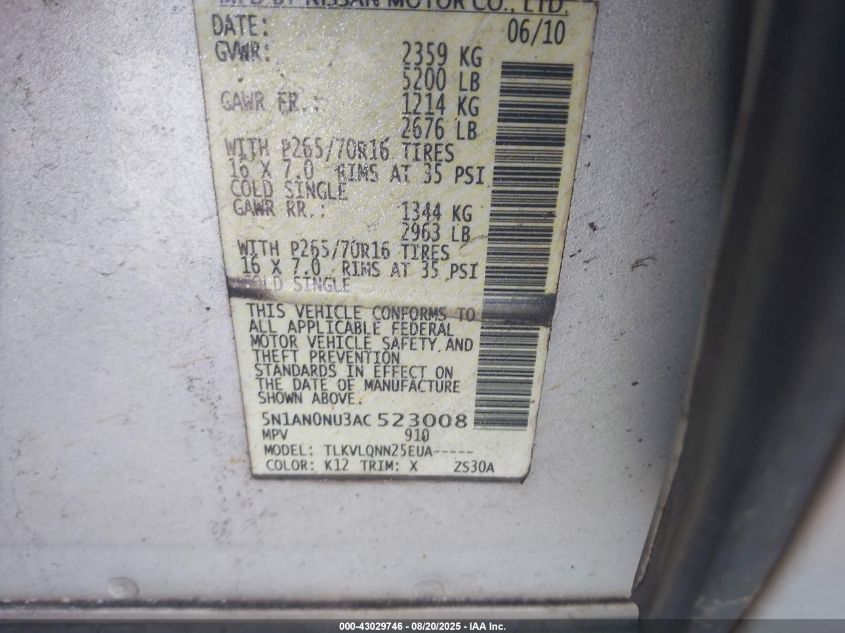 2010 NISSAN XTERRA - 5N1AN0NU3AC523008, цвет - Серебряный, 4.0, Бензин, из США