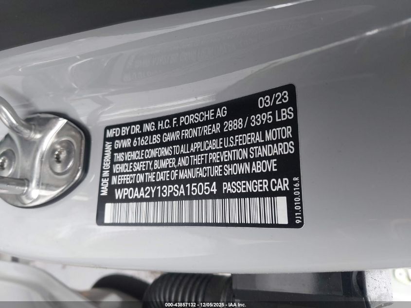 Цвет СерыйПривод Задний приводVIN WP0AA2Y13PSA15054Состояние НеизвестноПовреждения Левая сторона