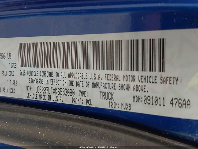 Цвет СинийЦилиндры 8Привод Полный приводVIN 1C6RR7LTXKS533080Состояние Стационарно