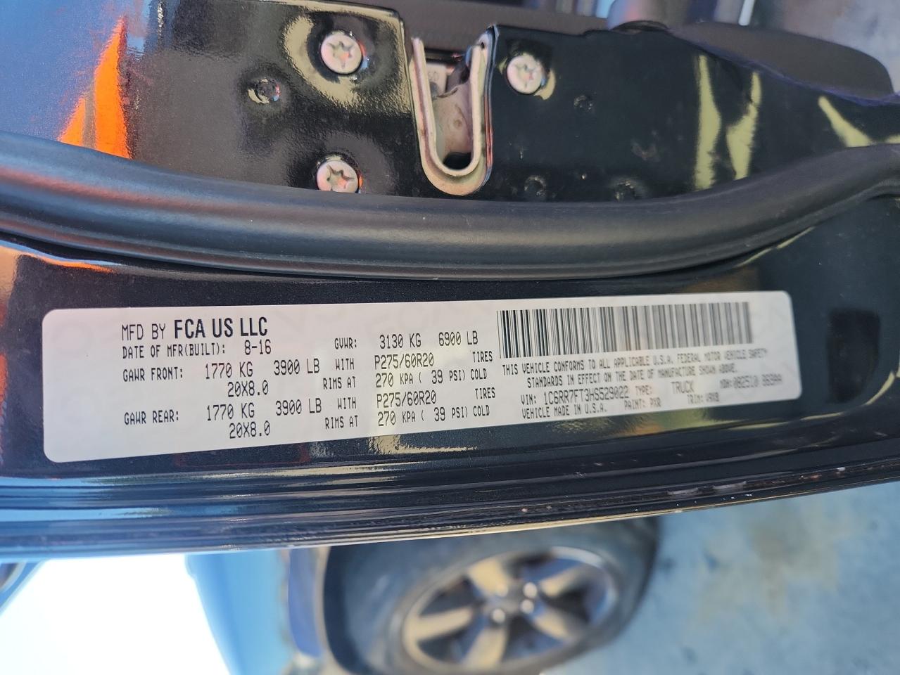 Цвет ЧерныйЦилиндры 8Привод 4x4 с задним приводомVIN 1C6RR7FT3HS529022Состояние НеизвестноПовреждения Передняя или задняя