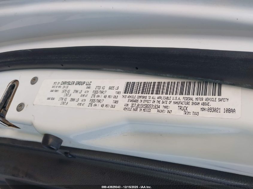 2011 RAM 1500 - 3D7JB1EK5BG531634, цвет - Белый, 3.7, Бензин, из США