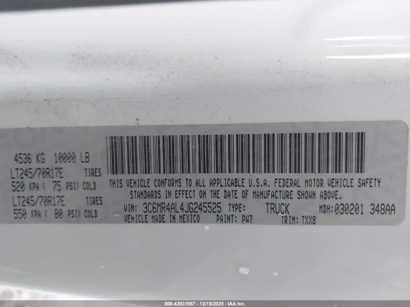 Цвет БелыйЦилиндры 6VIN 3C6MR4AL4JG245525Состояние СтационарноПовреждения Механические повреждения