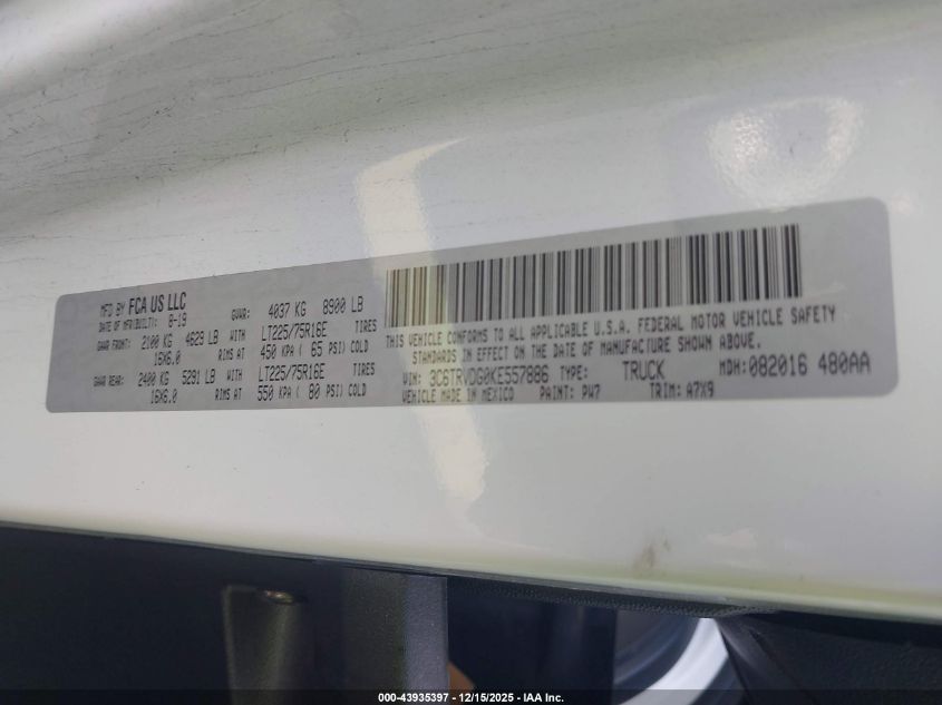 2019 RAM PROMASTER 2500 - 3C6TRVDG0KE557886, цвет - , 3.6, Бензин, Передний привод из США