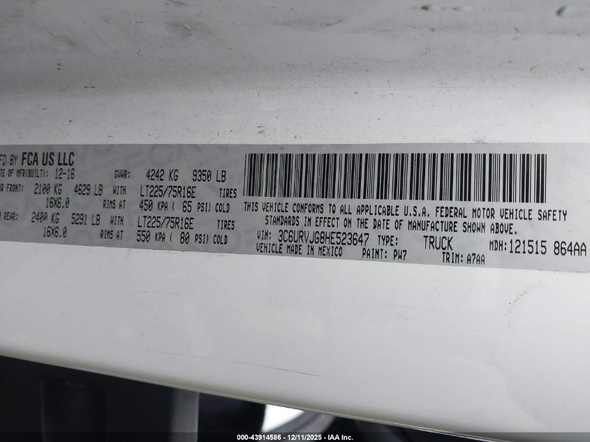 2017 RAM PROMASTER 3500 - 3C6URVJG8HE523647, цвет - Белый, 3.6, Бензин, Передний привод из США