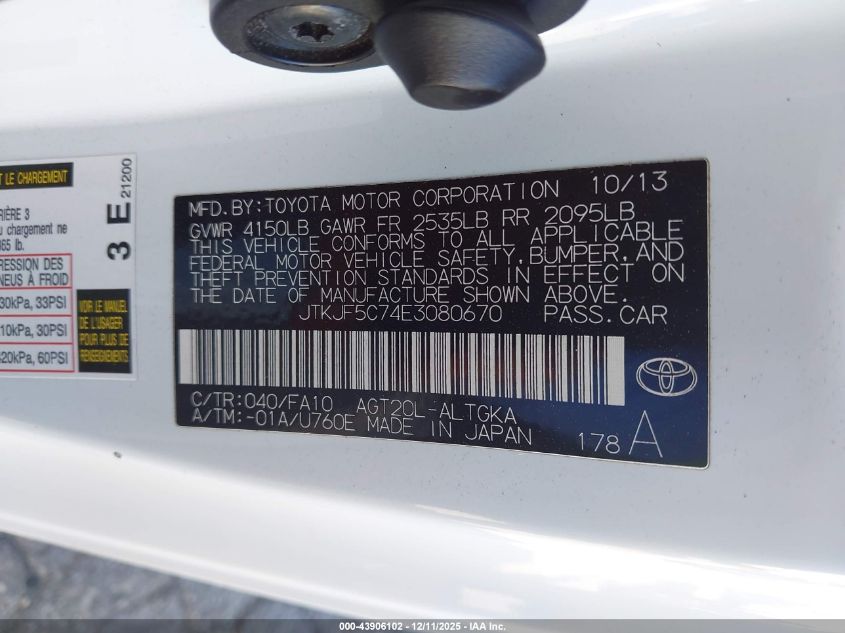 Цвет БелыйЦилиндры 4Привод Передний приводVIN JTKJF5C74E3080670Состояние Заводится и едет (проверено)Повреждения Левая сторона