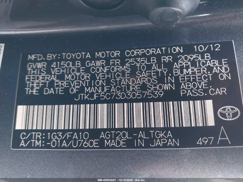 Цвет Цилиндры 4Привод Передний приводVIN JTKJF5C73D3057539Состояние НеизвестноПовреждения Задняя
