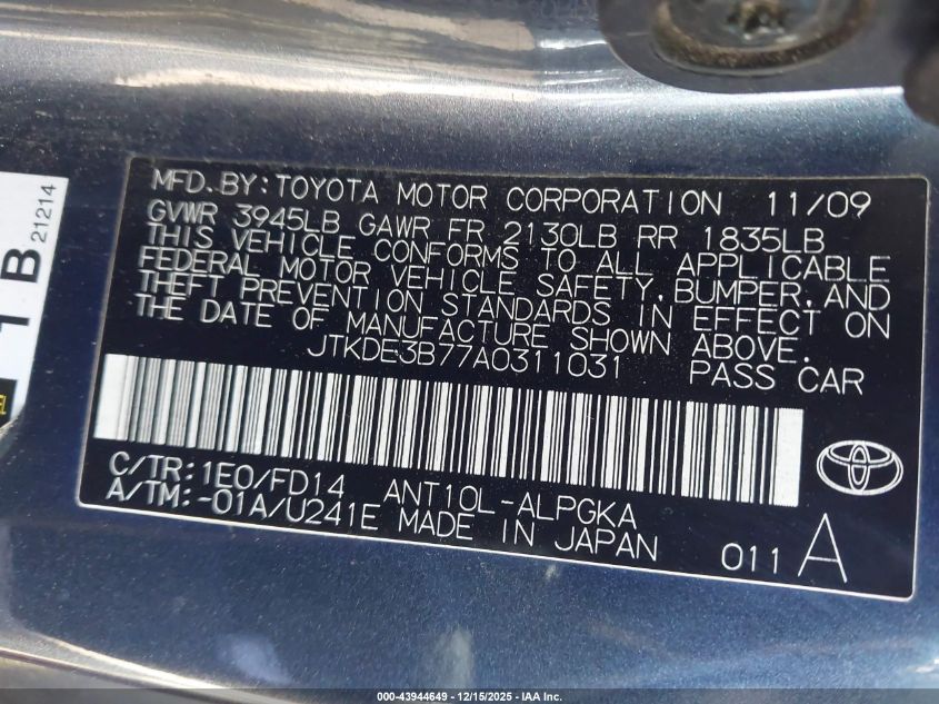 2010 SCION TC - JTKDE3B77A0311031, цвет - , 2.4, Бензин, Передний привод из США