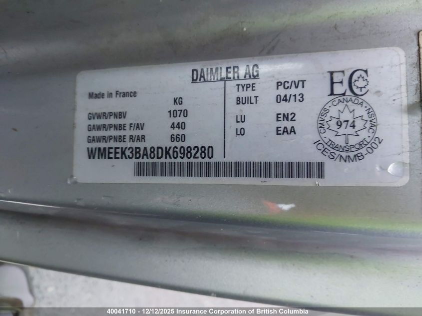 Цвет СинийЦилиндры 3Привод Задний приводVIN WMEEK3BA8DK698280Состояние Заводится и едет (проверено)Повреждения ПередняяДата аукциона 2025-12-15