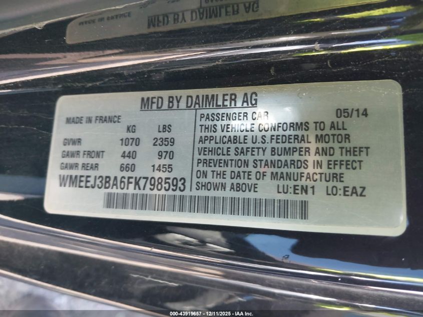 Цвет БелыйЦилиндры 3Привод Задний приводVIN WMEEJ3BA6FK798593Состояние СтационарноПовреждения Передняя или задняяДата аукциона 2025-12-17