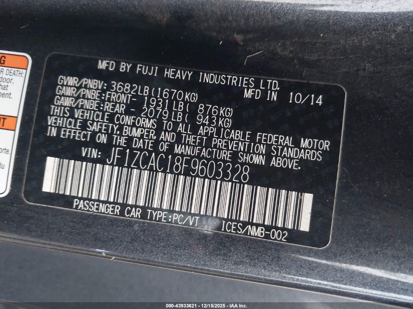 2015 SUBARU BRZ - JF1ZCAC18F9603328, цвет - , 2.0, Бензин, Задний привод из США