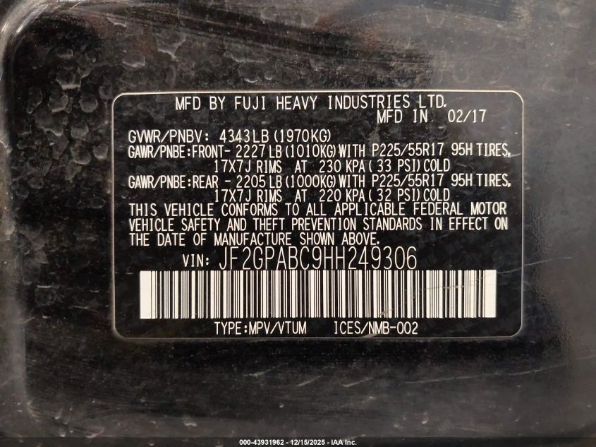2017 SUBARU CROSSTREK - JF2GPABC9HH249306, цвет - Черный, 2.0, Бензин, Полный привод из США