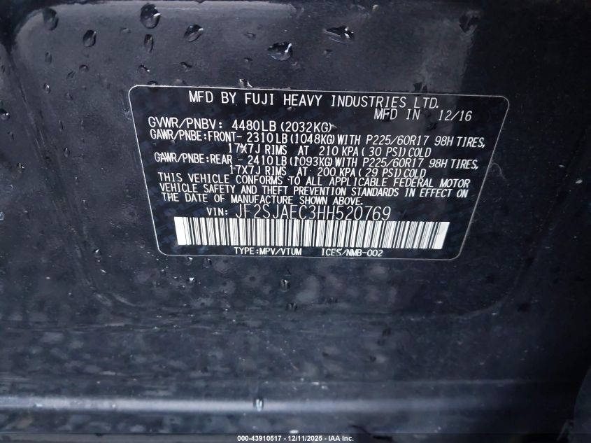 2017 SUBARU FORESTER - JF2SJAEC3HH520769, цвет - Серый, 2.5, Бензин, Полный привод из США