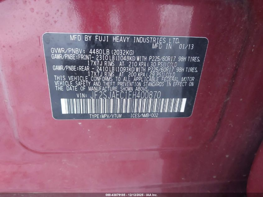 Цвет БургундияЦилиндры 4Привод Полный приводVIN JF2SJAEC1EH400870Состояние Заводится и едет (проверено)Повреждения Задняя