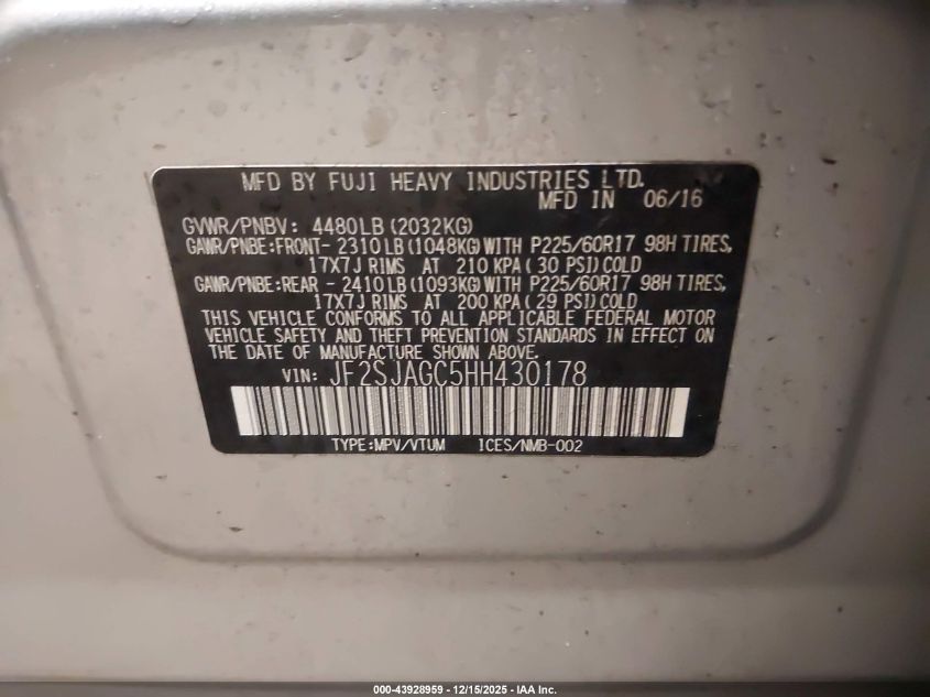 2017 SUBARU FORESTER - JF2SJAGC5HH430178, цвет - Серебряный, 2.5, Бензин, Полный привод из США