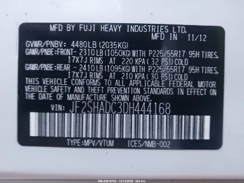 Цвет БелыйЦилиндры 4Привод Полный приводVIN JF2SHADC3DH444168Состояние Заводится и едет (проверено)Повреждения Правая сторона