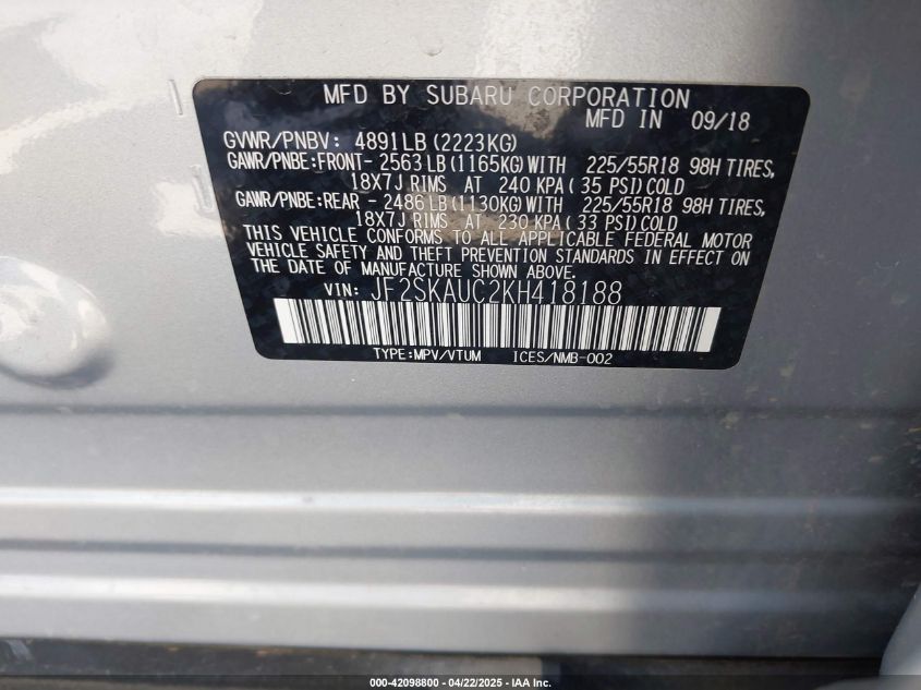 2019 SUBARU FORESTER - JF2SKAUC2KH418188, цвет - Серебряный, 2.5, Бензин, Полный привод из США