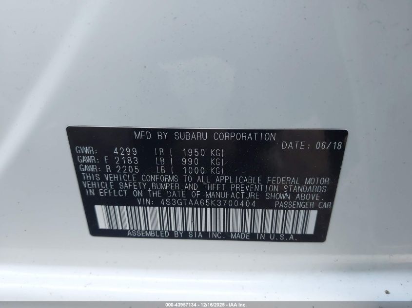 2019 SUBARU IMPREZA - 4S3GTAA65K3700404, цвет - , 2.0, Бензин, Полный привод из США
