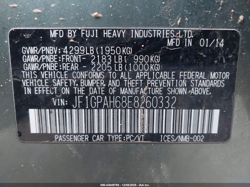 2014 SUBARU IMPREZA - JF1GPAH68E8260332, цвет - Серый, 2.0, Бензин, Полный привод из США