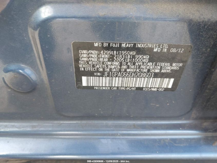 2013 SUBARU IMPREZA - JF1GPAG66DH208603, цвет - Синий, 2.0, Бензин, Полный привод из США