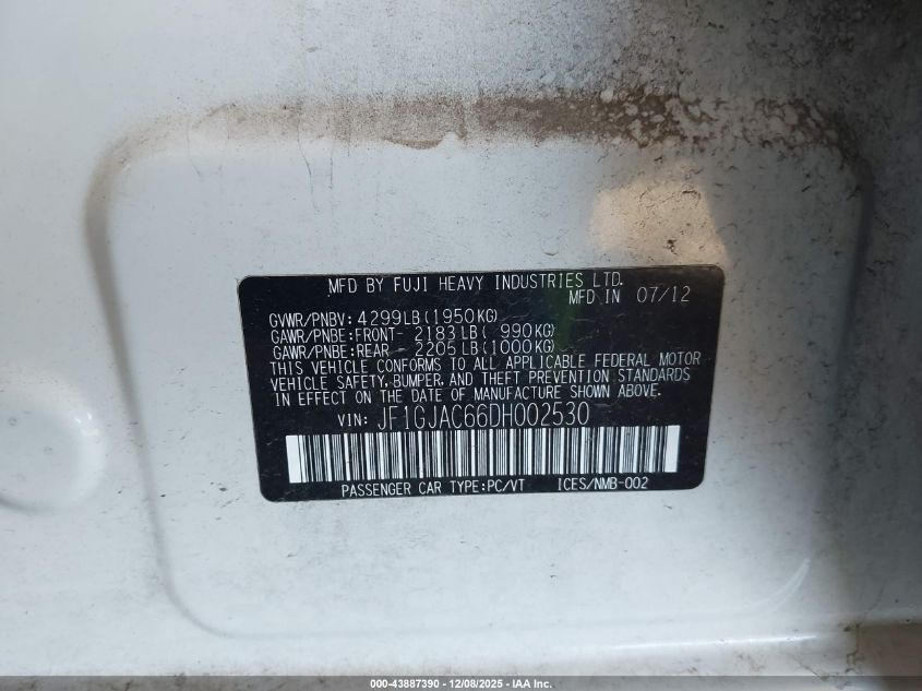 2013 SUBARU IMPREZA - JF1GJAC66DH002530, цвет - Белый, 2.0, Бензин, Полный привод из США