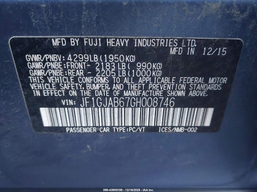 2016 SUBARU IMPREZA - JF1GJAB67GH008746, цвет - , 2.0, Бензин, Полный привод из США