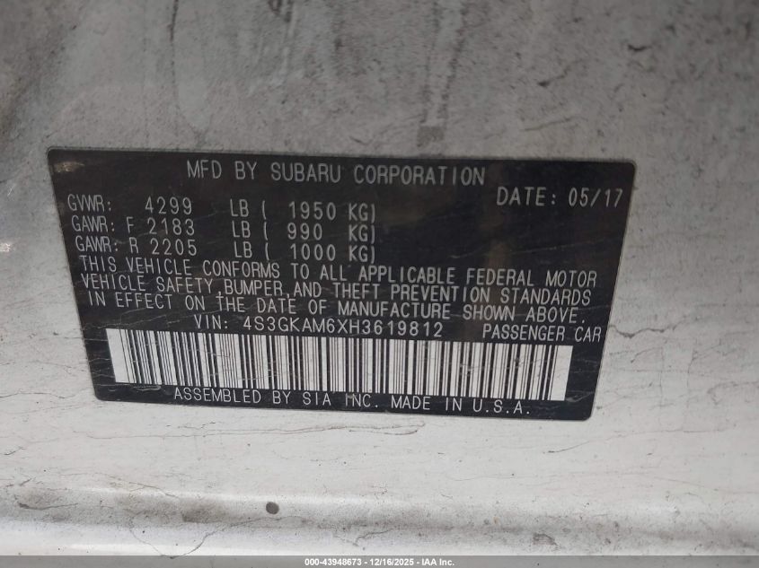 2017 SUBARU IMPREZA - 4S3GKAM6XH3619812, цвет - , 2.0, Бензин, Полный привод из США