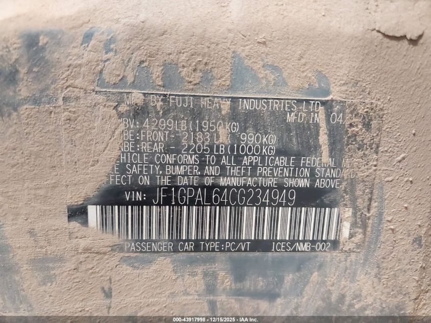 Цвет СинийЦилиндры 4Привод Полный приводVIN JF1GPAL64CG234949Состояние ЗаводитсяПовреждения Передняя и задняя