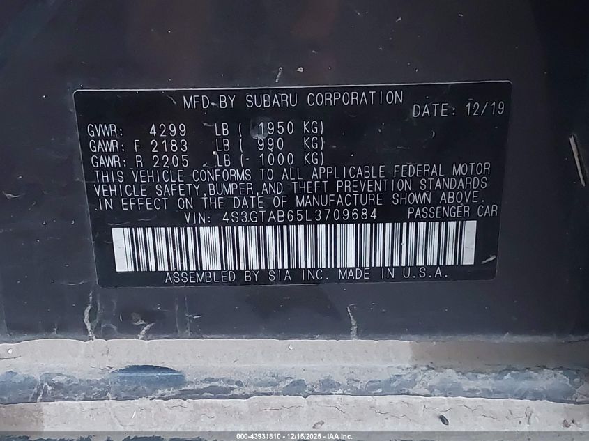 2020 SUBARU IMPREZA - 4S3GTAB65L3709684, цвет - Серый, 2.0, Бензин, Полный привод из США