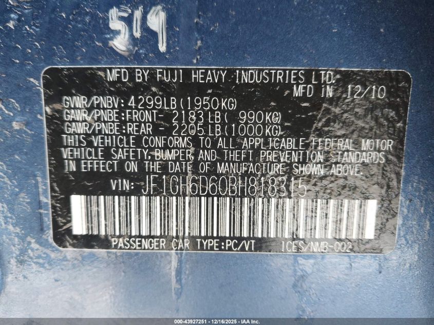 Цвет СинийЦилиндры 4Привод Полный приводVIN JF1GH6D60BH818315Состояние НеизвестноПовреждения Передняя или задняя