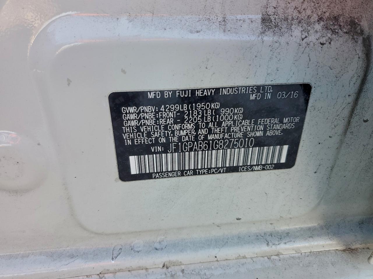 2016 SUBARU IMPREZA - JF1GPAB61G8275010, цвет - Белый, 2.0, Бензин, Полный привод из США