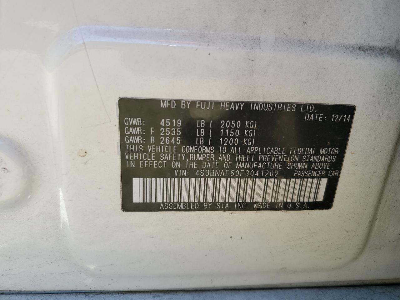 2015 SUBARU LEGACY - 4S3BNAE60F3041202, цвет - Белый, 2.5, Бензин, Полный привод из США