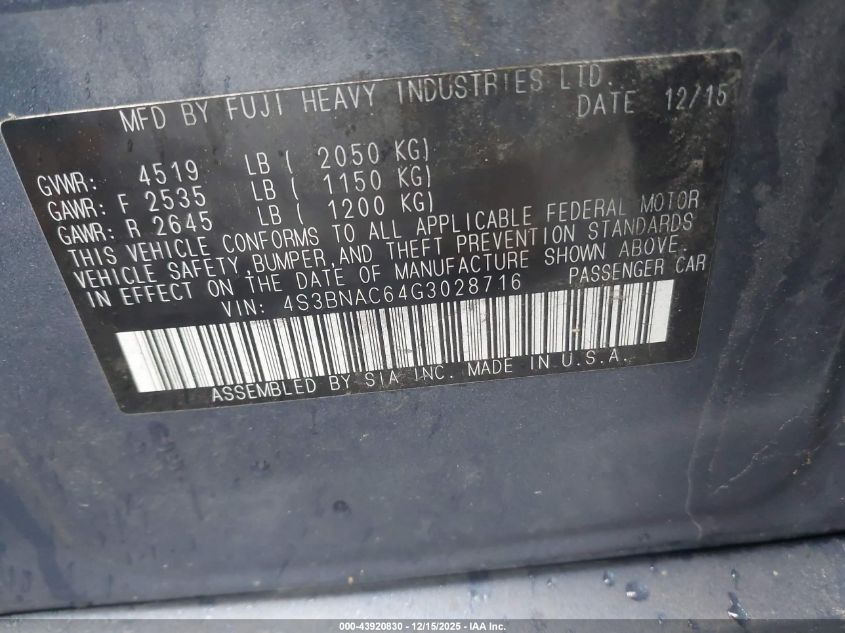 2016 SUBARU LEGACY 2.5I PREMIUM