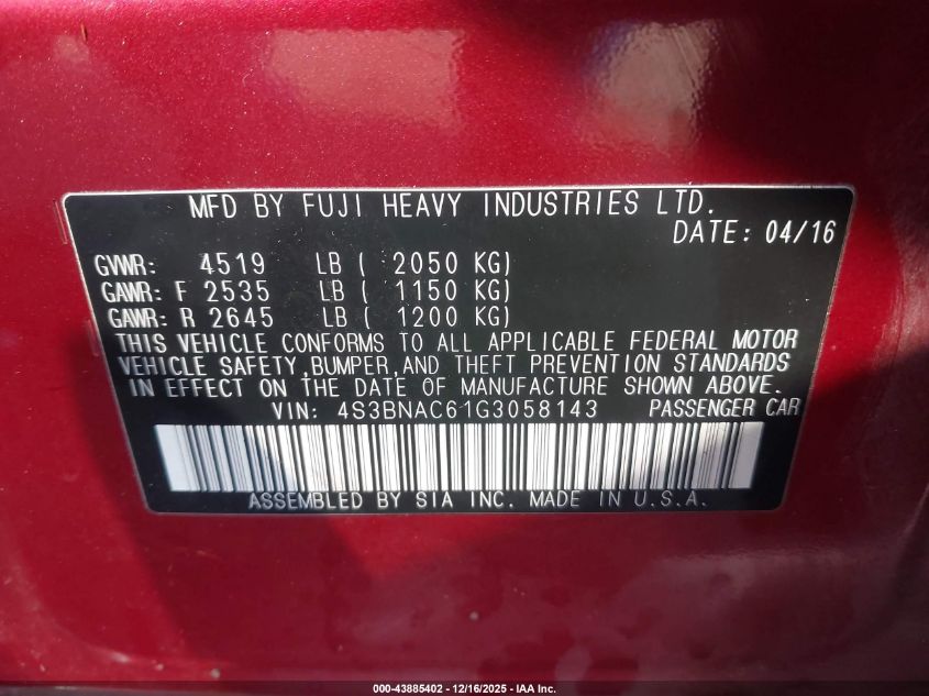 2016 SUBARU LEGACY - 4S3BNAC61G3058143, цвет - , 2.5, Бензин, Полный привод из США