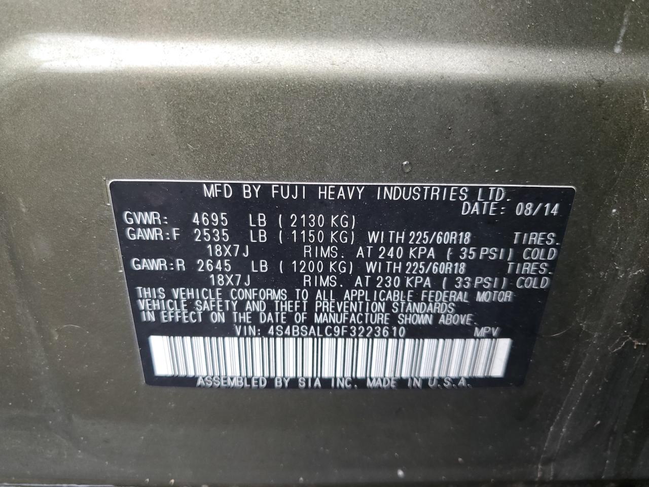 2015 SUBARU OUTBACK - 4S4BSALC9F3223610, цвет - Зеленый, 2.5, Бензин, Полный привод из США
