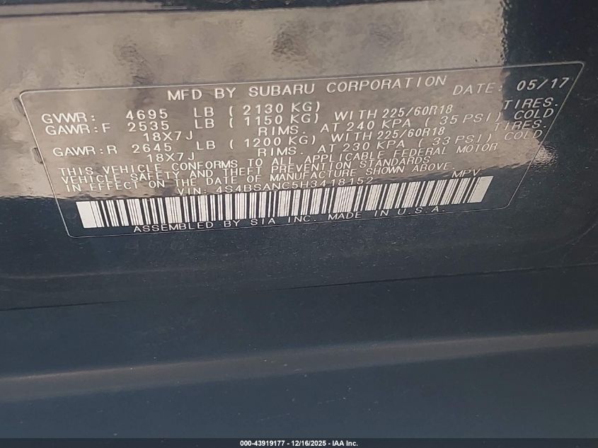2017 SUBARU OUTBACK - 4S4BSANC5H3418152, цвет - , 2.5, Бензин, Полный привод из США
