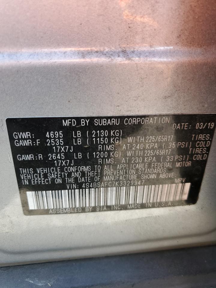 2019 SUBARU OUTBACK - 4S4BSAFC7K3329947, цвет - Серебряный, 2.5, Бензин, Полный привод из США