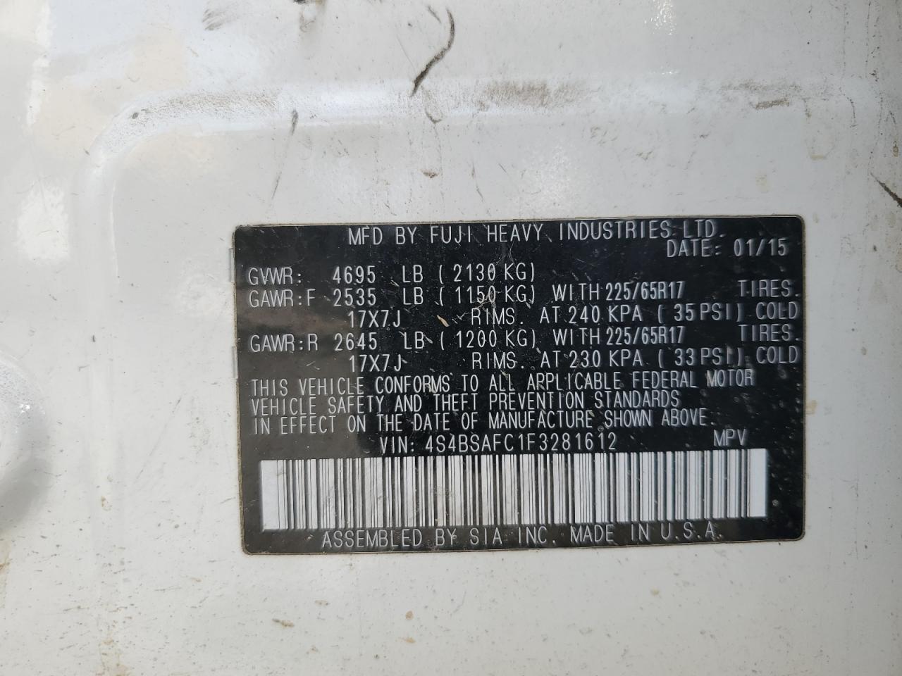 Цвет БелыйЦилиндры 4Привод Полный приводVIN 4S4BSAFC1F3281612Состояние Заводится и едет (проверено)Повреждения НезначительныеДата аукциона 2025-10-07