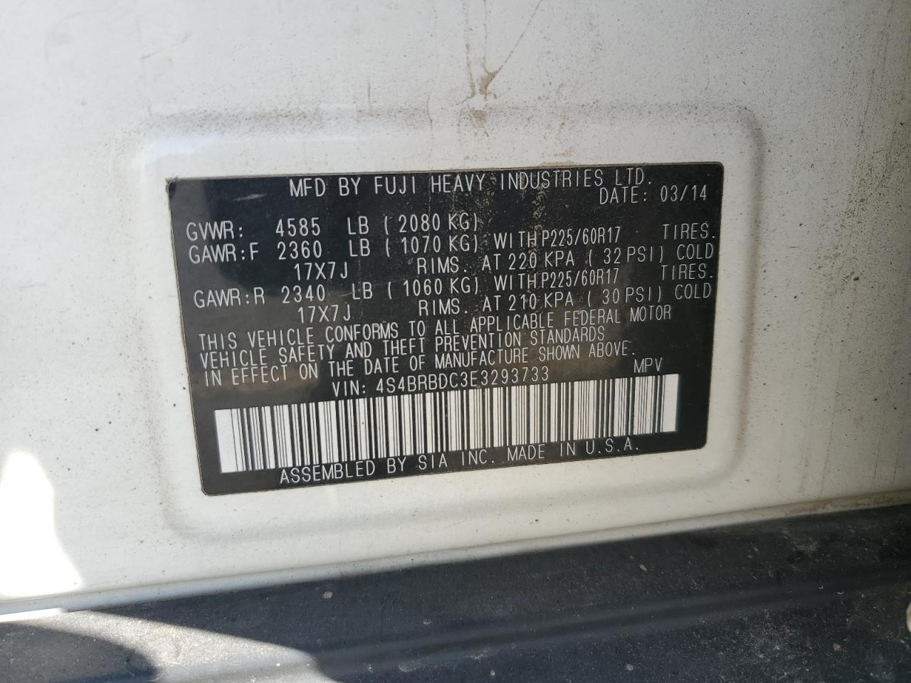 2014 SUBARU OUTBACK - 4S4BRBDC3E3293733, цвет - Белый, 2.5, Бензин, Полный привод из США